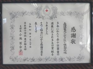 日本赤十字社 東京都支部支部長様から「銀枠支部長感謝状」